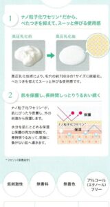 ナノ粒子ワセリンで驚くほど伸びがよく、使用感はベタつかずサラッとしています☆